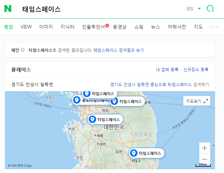 태임스페이스라고 했더니 검색하면 자동으로 인천 송도의 "타임스페이스"가 검색 결과로 나온다.